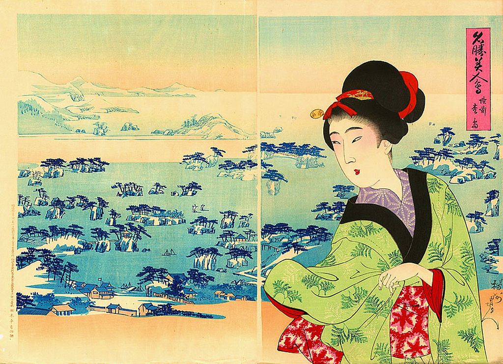 Other adorable print series include “Chiyoda no Ooku” (Court Ladies of the Chiyoda Palace) and “Shin Bijin” (True Beauties). Of course, Chikanobu produced many amazing pieces of art but both the above named series relate to genuine aspects of female beauty in Japan. This is highlighted by traditional clothes, for example the kimono, to the changing nature of the time which applies to Western dress styles.