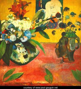 On this (http://www.paul-gauguin.net) website it is commented that “Like his friend Vincent Van Gogh, with whom in 1888 he spent nine weeks painting in Arles, Paul Gauguin experienced bouts of depression and at one time attempted suicide. Disappointed with Impressionism, he felt that traditional European painting had become too imitative and lacked symbolic depth. By contrast, the art of Africa and Asia seemed to him full of mystic symbolism and vigour. There was a vogue in Europe at the time for the art of other cultures, especially that of Japan (Japonisme). He was invited to participate in the 1889 exhibition organized by Les XX.”