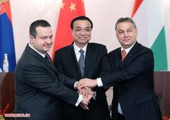 Photo: Hungarian, Serbian and Chinese leaders shake hands at the ceremony announcing their agreement for the new Hungaro-Serbian High-Speed Railway (HSR) project.