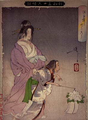 The neighbor was elderly and the sight was revolting. However, Ogiwara Shinnojo had been bewitched by the beauty of Otsuyu because of his own broken heart therefore he was easily fooled. The tender body and firm breasts were real to Ogiwara but little did he know that this had empowered Otsuyu and enabled her to appear like she once had been.