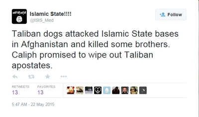 IS follower @ISIS_Med tweeted on May 22, “Taliban dogs attacked Islamic State bases in Afghanistan and killed some brothers. Caliph promised to wipe out Taliban apostates.”