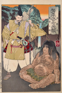 Toshidama Gallery comments about the depiction of Kintaro by the artist Utagawa Yoshikazu by stating: “Yoshikazu portrays Kintaro (the Golden Boy) wrestling one of Yorimitsu’s retainers. Kintaro, as with so many Japanese heroes, is the subject of legend and possibly some fact. Raised by his mother near Mount Kintoki it was said that he was a wild child of superhuman strength – wrestling bears, uprooting trees – and he befriended and spoke to animals especially his friends the monkeys.”