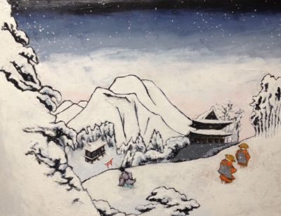 Before focusing on the bigger picture, the art piece itself titled “Art of Buddhism and Shintoism and Two Paths in the Snow,” is an adorable piece of art by Utsumi. This is based on the amazing landscape, the three holy men of Buddhism and Shintoism, the terrible winter conditions, the power of faith, and the distant Buddhist temple and Shinto shrine.