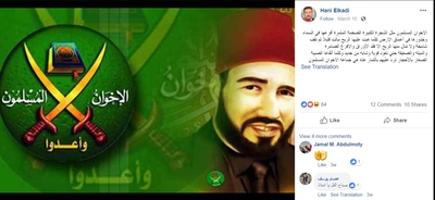 He regularly posts Muslim Brotherhood symbols and messages on his Facebook feed, such as a March 10 graphic with the Brotherhood’s symbol next to an image of its founder Hassan al-Banna.