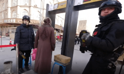 Photo source: Police stop and frisk citizens on an unidentified street in Xinjiang. (Source: BBC) was uploaded in the original article by The Jamestown Foundation
