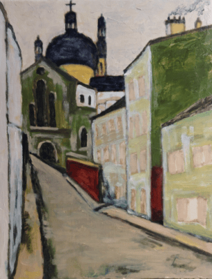 The above is conjecture because Saeki painted other Christian churches in Paris. Despite this, the painting of the Church of Saint Anne and the foreboding skyline does hint at inner despair. Hence, Utsumi is seeking to bypass the timeline by painting a more uplifting version and imagining that this is how Saeki once felt about Paris during his initial period.