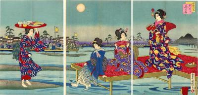 The Artelino website says, “His works represent the ongoing changes in Japan from the old Edo to the Meiji era. Kuniteru’s prints show traditional ukiyo-e scenes as well as images from the beginning industrialization of Japan.”