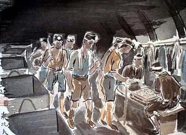 In the following art piece, the focus is on a group of miners. Hence, Sanzō is focusing on workers who face a hard life to survive financially: while health problems related to the lungs and other ailments – and disasters concerning miners were all too real.