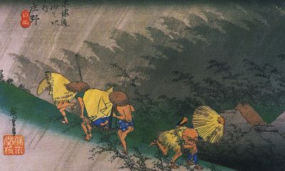 The last art piece is a lovely print by the esteemed Hiroshige (1797-1858). In this print, travelers are caught out by the sudden storm that breaks out. One can also imagine the heat concerning the attire of the travelers.