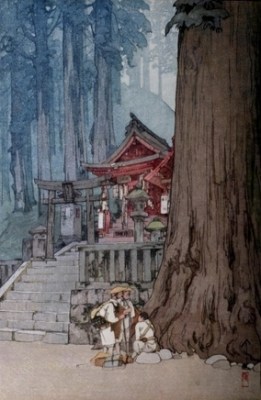 Yoshida Hiroshi focuses on Shinto pilgrims in Nikko. These pilgrims are enjoying the spiritual angle where Shintoism and nature naturally fuse. The far background also denotes mist – while the shrine and trees unite to entice Shinto pilgrims to pray.
