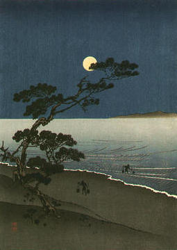 In these three art pieces, the moon is utilized by Yoshimune Arai to a beautiful effect. Accordingly, in the first art piece, an elegant lady is enjoying her boat trip – with the moon and skyline providing a delightful scene.