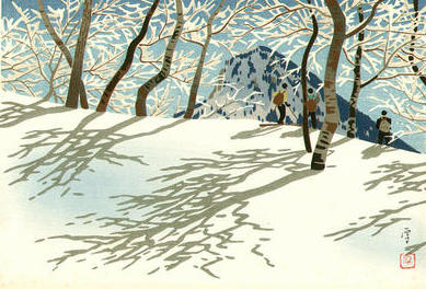 In this art piece, the theme is rather mundane. This concerns a typical skiing trip to Shiga Kogen. However, Okumura’s usage of color, nature, shadows, the snow-filled landscape, and the mountain in the distance all come delightfully together. Therefore, another exquisite art piece by Okumura.