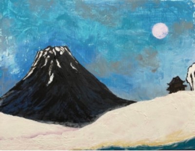 The second art piece pays homage to the esteemed Kamisaka Sekka (1866-1942). Sekka illuminated the world of Rinpa (Rimpa) art. However, Utsumi alters the color dynamics in her art piece titled “Radiant Nightfall Moon in Old Japan” by focusing on a deep blue color scheme and a dramatic moon – compared to the lightness of the original by Sekka.