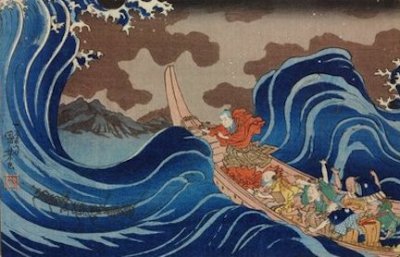 The first art piece by Kuniyoshi shows Nichiren on his way to exile on Sado Island. Kuniyoshi shows people on a small boat with all but one person fearing death because of the terrible storm.