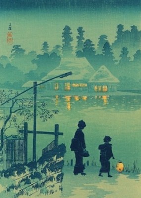 In the art piece above by Shōtei, two people are enjoying a lakeside walk. The lake, lantern, country houses, and the feel of tranquility all embolden the different shades of night.