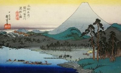Hiroshige (1797-1858) inspired impressionists from all over the northern hemisphere. His delightful art above focuses on the Fuji River and the esteemed mountain that is imprinted in the mind of people who know only a smidgeon about Japan.