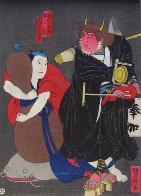 The Toshidama Gallery says: “The figure on the left holds a giant gourd – this was known to be one of the few magical ways to quell the much feared catfish which in the print is lying compliantly underneath. The legends of Japan say that earthquakes and tsunamis are caused by the writhing of a giant catfish (namazu) under Fuji. There were popular prints of the quelling of the catfish (Namazu-e) which appeared after natural disasters such as the Ansei earthquake of 1855. One reading of the print is that the actor on the left is obliged to hold the gourd on the catfish whilst having to confront the feared Oni demon on the right – caught between the devil and the deep blue sea as it were.”