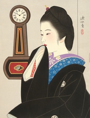 Similarly, the reality represented in the prints by Shinsui hides the bigger picture of Japanese culture and society – where only the clicking clock is constant. Accordingly, the treatment of women – high culture to the working poor and the convulsions of this vast period (positive and negative) of Japanese history are out of sight.