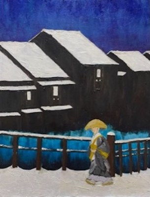 This art piece pays homage to the acclaimed Kawase Hasui (1883-1957). However, the angle is changed dramatically by Sawako Utsumi. Accordingly, the beautiful lady by Kawase Hasui is replaced cleverly by a Buddhist monk who conjures up mountain life. Therefore, the Buddhist monk by Sawako Utsumi and the lovely shades of blue create a new dimension.