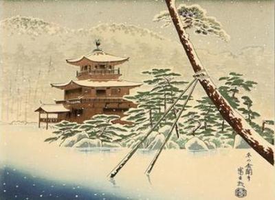 Above is the Temple of the Golden Pavilion (Kinkaku-ji) in Kyoto by Tomikichiro Tokuriki (1902-1999). This stunning Buddhist temple was known to Tomikichiro Tokuriki because he was born in this rich cultural city.