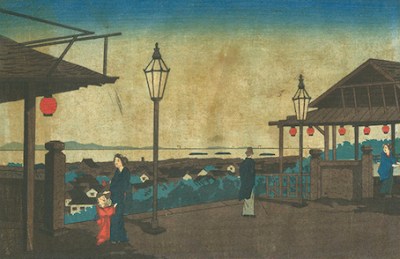 In contrast, the print above focuses on the continuity of the Asakusa Kannon Buddhist temple. Accordingly, people are enjoying the evening view in this famous Buddhist compound.