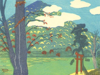 The final art piece shows a small Shinto gate by Lake Chuzenji (Nikko) – with the imposing Mount Nantai in the backdrop. Lake Chuzenji is the highest natural lake in Japan.