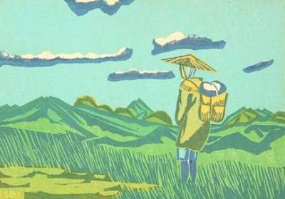The British Museum says, “He studied at the Kansai Bijutsuin from 1905, at first with Asai Chu (1856-1907), and moved to Tokyo in 1911 where he began his long career as a cartoonist on the magazine ‘Tokyo Puck’. In Tokyo he was inspired by Minami Kunzo (1883-1950) to take up self-carved woodblock printing…”