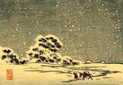All three art pieces focus on snow-filled landscapes in the mountains of Japan. Accordingly, despite the bleakness and wintery conditions, a sense of freedom and determination persists concerning the individuals in each art piece.