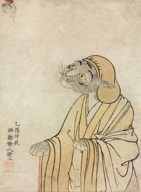 The innovative art above is by Okubo Tadanobu (1722-1777). In this art piece, the cat is the protector of the written words of Buddhism. Cats were brought to Japan in increasing numbers during the Nara Period (710-794) for a specific purpose. Accordingly, cats protected important Buddhist scrolls from gnawing rats.