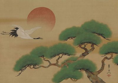 The MET Museum says, “A crane soars across the sun, and the evergreen pine tree complements the association of this avian species with longevity. The simple, bold image may be viewed as an abbreviated representation of Mount Hōrai, mythical island of the immortals, intended for display at the onset of the lunar calendar. Suzuki Kiitsu, pupil of Sakai Hōitsu (1761–1828), ensured the continuity of Rinpa art into modern times, enlivening a genre that might otherwise have become overly formulaic and static.”