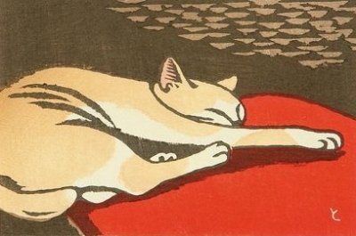 The British Museum says, “Inagaki is best known for his many prints of cats which gained him a wide following in the West, but the first of these was not produced until 1951 after nearly thirty years as a typical artist of the Creative Print Movement. He was obliged to make his living until that time by teaching and various sorts of commercial design work such as ‘ex libris’ plates and posters.”