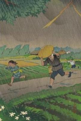 The art above is by Hiyoshi Mamoru. He depicts two children and their father running home to escape the storm. It is easy to relate to this scene – the noise of thunder, the flash of lightning, and the start of heavy rain.