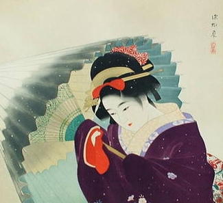 The British Museum says, “His paintings include folding screens and albums as well as hanging scrolls, and he was equally at home on paper or silk, and in female subjects drawn from high or bourgeois life, the traditional dance forms, geishas, or the theatre. Today he and Uemura Shoen (1875-1949) are recognized as the two greatest ‘bijinga’ artists of the ‘Nihonga’ movement.”