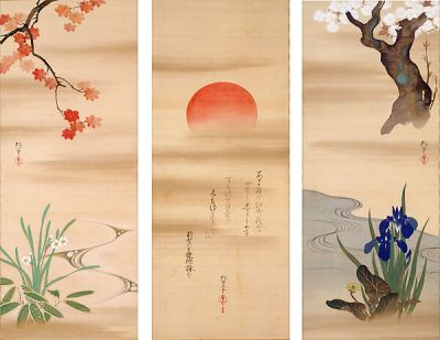Above, Sakai Hōitsu magnifies the radiant rising sun by depicting the four seasons of nature.