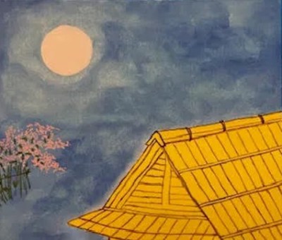The mystical night, illuminated by the gentle glow of the moon, contrasts exquisitely with the delicate blossoms and the refined silhouette of a Japanese-style building. This quiet interplay of light and shadow, nature and architecture, evokes a dreamlike atmosphere — one that draws the viewer inward. It’s easy to imagine the mind slipping into contemplation, as mystery, serenity, and stillness rise softly to the surface, stirring the emotions in ways that words cannot fully capture.