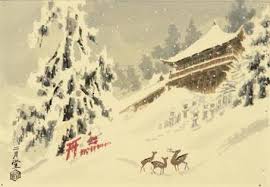 The art piece above is the Nigatsu-dō – a vibrant structure of the Todai-ji Buddhist Temple compound in the city of Nara. The Todai-ji website says, “The name Nigatsu-dō, or Second Month Hall is derived from the fact that the Shuni-e Ceremony is held here during the second month of the lunar calendar. The structure is said to have been first erected by the monk Jitchū (fl. 760-820), Rōben’s chief disciple. In 1667, however, a fire broke out inside the hall in the midst of the ceremony, and the original was destroyed. The present building is a reconstruction of 1669.”