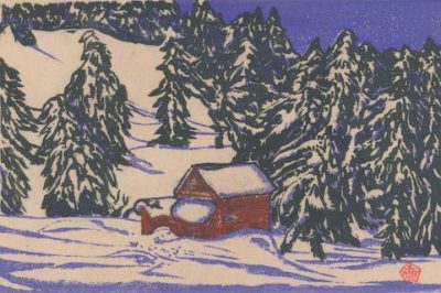 The striking winter landscape that follows is the work of Kato Tetsunosuke, an artist active from the mid-1920s into the early postwar era. This evocative image portrays a solitary dwelling within a snowbound hamlet, surrounded by the vast natural world. Kato devoted much of his attention to the rugged environments of Hokkaido. Although little is widely recorded about his life, the surviving prints offer a compelling window into the stark beauty and expansive landscapes of northern Japan.