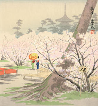 In the final print, two figures quietly enjoy the ephemeral beauty of cherry blossoms. Their shared moment evokes a gentle intimacy, where time appears to slow beneath the falling petals. Cherry blossoms, so deeply embedded in Japanese culture, radiate a warmth that transcends even the gloomiest of days—reminding the viewer of both the fragility and enduring beauty of life.