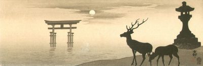 In the first composition, Koson weaves together the spiritual essence of Japan with the serenity of the natural world. A solitary torii gate rises with quiet dignity, marking the threshold between the earthly and the divine—a symbol deeply rooted in Shinto belief. Its presence, poised beside still, mirror-like waters, evokes a sense of timeless calm. Nearby, deer linger at the water’s edge, their delicate forms embodying both grace and an unspoken connection to the sacred landscape. Above them, the sky unfolds in gentle hues, completing a scene that feels suspended between reality and reverie.